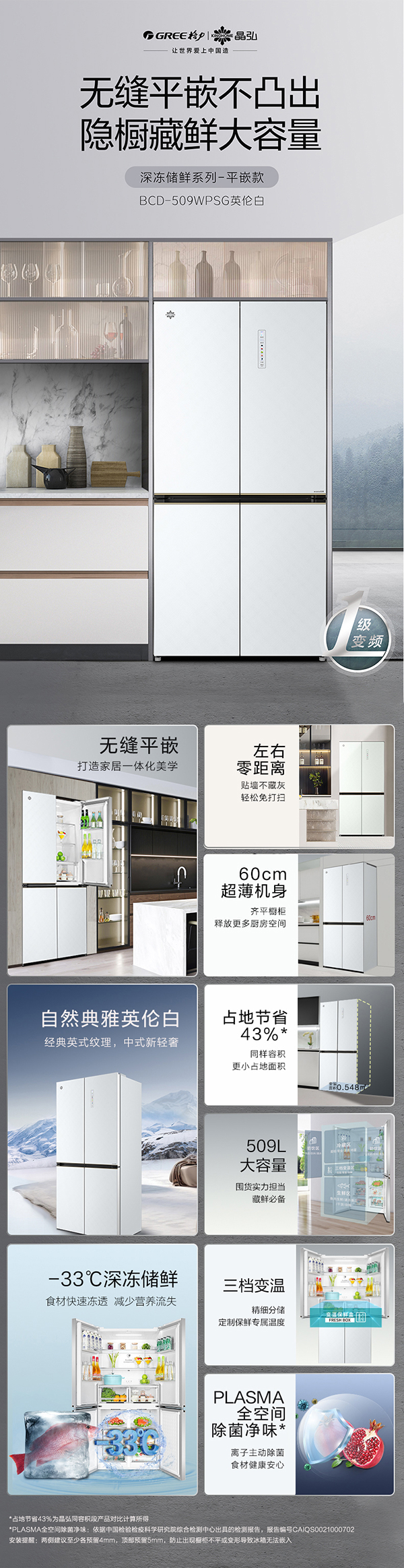 -33攝氏度深凍儲鮮;PLASMA全空間除菌凈味;平齊不凸出;雙通道循環散熱